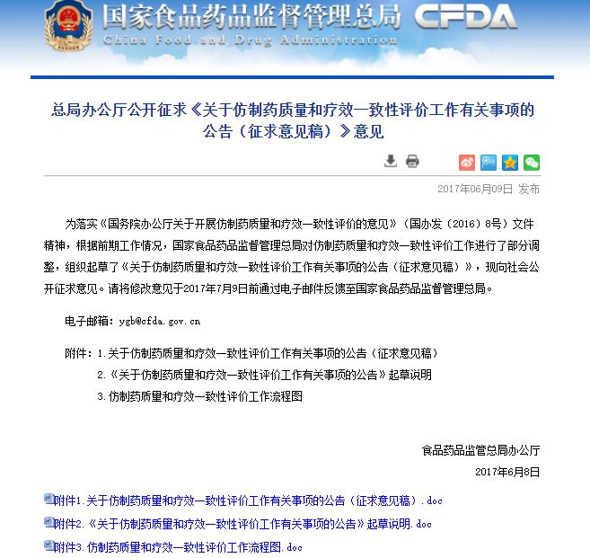 6月9日,國家食品藥品監(jiān)督管理總局在其官網(wǎng)披露了《關(guān)于仿制藥質(zhì)量和療效一致性評價(jià)工作有關(guān)事項(xiàng)的公告(征求意見稿)》(下文簡稱《征求意見稿》),向社會公開征求意見,意見反饋截止時(shí)間為2017年7月9日。
