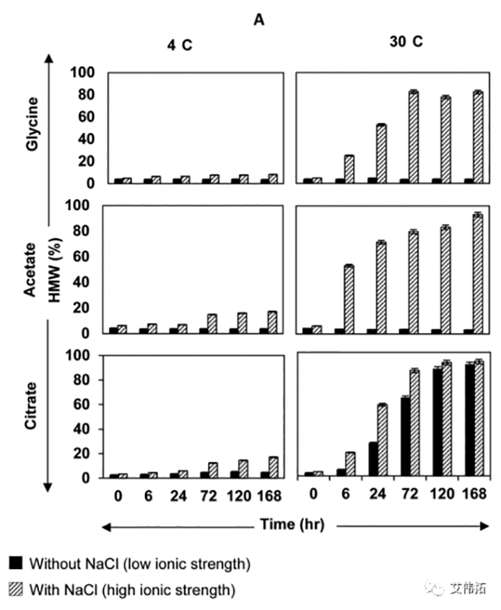 ② 與醋酸鹽和甘氨酸緩沖液相比,檸檬酸緩沖液傾向于導(dǎo)致更高的蛋白聚集,特別是在高溫下。