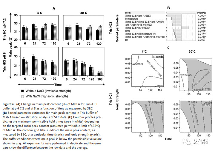 圖4B展示了統(tǒng)計(jì)建模的結(jié)果??梢钥闯?,與陽離子交換層析一樣,pH和時(shí)間對(duì)確定主峰含量起關(guān)鍵作用。