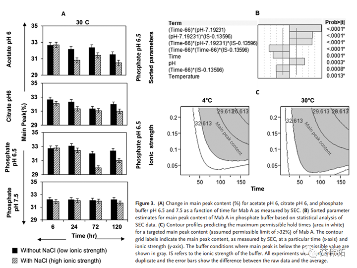 從圖3A中也可以看出,在pH為7.5時(shí),磷酸鹽緩沖液中抗體蛋白的主峰含量變化可以忽略不計(jì),而在pH為6.5時(shí),相同的緩沖液發(fā)生了突出變化。在pH值為6.5時(shí)觀察到的一個(gè)有趣現(xiàn)象是,隨著時(shí)間的推移,主峰含量先降低后增加。