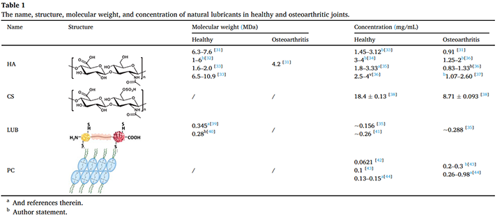 關(guān)節(jié)軟骨可以承受低摩擦系數(shù)的高壓,這是由于滑液中的大分子,如HA、CS、LUB和PC。表1總結(jié)了健康關(guān)節(jié)和骨關(guān)節(jié)炎關(guān)節(jié)中天然潤滑劑的結(jié)構(gòu)、分子量和濃度。
