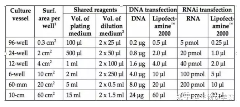 加入轉(zhuǎn)染試劑到每個孔的培養(yǎng)基中,6h后,更換成完全培養(yǎng)基,繼續(xù)培養(yǎng)到24-48小時(不同的質(zhì)粒和脂質(zhì)體zui佳搭配比例不同,轉(zhuǎn)染前,應(yīng)該摸一個zui佳配比。質(zhì)粒:脂質(zhì)體=1:1,1:1.5,1:2,1:2.5,1:3,1:3.5的梯度比例來檢測zui佳轉(zhuǎn)染比例,一般質(zhì)粒有帶熒光,可以通過觀察每組熒光強弱來判斷轉(zhuǎn)染效率)。以下為不同規(guī)格的培養(yǎng)板需要加DNA和lipo2000的量。