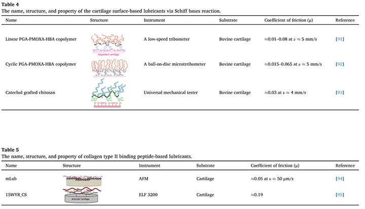 與非特異性軟骨組織結(jié)合潤滑劑相比,將潤滑劑錨定在軟骨表面表明,表面結(jié)合對于形成堅固的邊界層以實現(xiàn)較大潤滑至關(guān)重要,從而取代潤滑劑與關(guān)節(jié)軟骨之間發(fā)生的疏水和/或靜電相互作用。在這一部分中,我們將重點關(guān)注基于生物激發(fā)潤滑素的特定軟骨組織結(jié)合潤滑劑,利用諸如通過與軟骨表面的胺和靶向軟骨表面的軟骨基質(zhì)結(jié)合肽的希夫堿反應(yīng)進行化學吸附的機制。