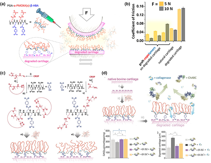 (a)通過暴露在軟骨表面的氨基與HBA基團上的醛官能團之間的希夫堿反應(yīng)將共聚物固定在降解軟骨上。(b)與天然和降解軟骨相比,接枝聚合物在降解軟骨上的摩擦系數(shù)。圖片(a, b)改編自文獻。(c)線性和環(huán)狀PGa-PMOXA-HBA共聚物的合成及其在降解關(guān)節(jié)軟骨上的組裝。(d)環(huán)PGa-PMOXA-HBA共聚物在降解軟骨上的自組裝及改性膜對軟骨酶降解的抑制作用