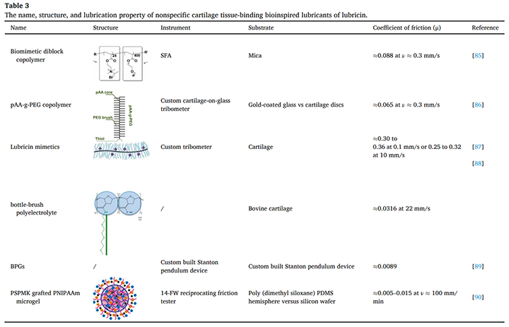 如前所述,潤滑油具有三塊環(huán)和瓶刷分子結(jié)構(gòu)。因此,天然潤滑劑可以為軟骨表面提供較低的摩擦系數(shù),但由于提取過程復雜,且在人或?;篬50]中含量較低,不易獲得大量滿足醫(yī)療需求的潤滑劑。而潤滑素具有高度糖基化的串聯(lián)重復單元,這使得其重組合成具有不同的挑戰(zhàn)性。為了大規(guī)模生產(chǎn)treatment方法,有必要開發(fā)具有與潤滑素相似結(jié)構(gòu)和功能的合成生物聚合物來減緩骨關(guān)節(jié)炎的進展。在這里,我們根據(jù)它們與軟骨表面的相互作用將它們分為兩組,即非特異性(表3)和特異性(表4、表5)由潤滑素啟發(fā)的軟骨組織結(jié)合潤滑劑。