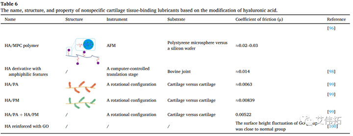 由于其特殊的生物學特性、簡單性和低侵入性,用透明質(zhì)酸補充滑液仍然是treatment骨關(guān)節(jié)炎的一種流行療法。然而,透明質(zhì)酸的主要缺點是其剪切變薄作用快速clean和體內(nèi)降解。為了增加HA在膝關(guān)節(jié)的停留時間,實現(xiàn)更長的潤滑時間,研究人員著重對HA進行修飾,包括非特異性軟骨組織結(jié)合潤滑劑和特異性軟骨組織結(jié)合潤滑劑(表6)。