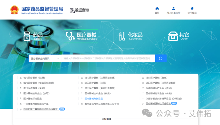 醫(yī)療器械分類查詢可以通過NMPA官網(wǎng)醫(yī)療器械欄-醫(yī)療器械查詢,網(wǎng)站如下: