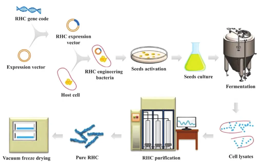 從動(dòng)物結(jié)締組織中提取膠原蛋白周期長(zhǎng)、產(chǎn)量低,所得產(chǎn)物成分復(fù)雜,目標(biāo)蛋白分離困難,異種組織間會(huì)產(chǎn)生免疫排斥反應(yīng),近年來爆發(fā)的禽流感和瘋牛病導(dǎo)致動(dòng)物源膠原蛋白可能攜帶病毒等污染源,其生物安全性無法得到保障,在一定程度上限制了膠原蛋白的開發(fā)利用。隨著蛋白質(zhì)工程技術(shù)的發(fā)展,利用基因工程技術(shù)將人體膠原蛋白的DNA序列轉(zhuǎn)入不同的宿主細(xì)胞中,通過發(fā)酵、分離純化獲得重組人源膠原(Recombinant human collagen, RHC)的研究越來越廣泛。