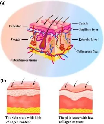 圖1 (a)人體皮膚結(jié)構(gòu)圖;(b)組織內(nèi)膠原蛋白含量對(duì)皮膚狀態(tài)的影響