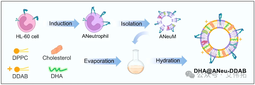 盡管源于中性粒細(xì)胞膜的仿生納米囊泡已展現(xiàn)出良好的炎癥靶向遞送和生物相容性,但其在炎癥肺組織中的分布仍有待改善。對于肺部疾病,通過靜脈注射方式實現(xiàn)肺部靶向遞送的困難在于克服納米囊泡在肝臟或脾臟組織中的分布。理想的靶向納米囊泡遞送系統(tǒng)需具備快速蓄積、延長在肺組織內(nèi)滯留時間,并及時被炎癥微環(huán)境的細(xì)胞內(nèi)化,最大限度地發(fā)揮治療效果。受選擇性器官靶向策略啟發(fā),DDAB陽離子脂質(zhì)具有提高肺組織靶向性的優(yōu)勢。有鑒于此,作者設(shè)計并構(gòu)建了一種工程化仿生雜化囊泡負(fù)載DHA,以實現(xiàn)對ARDS的分級靶向遞送治療。該分級靶向雜化囊泡(ANeu-DDAB)由含有活化β2整合素構(gòu)象的中性粒細(xì)胞膜與陽離子脂質(zhì)體(Lip-DDAB)雜化融合而成。通過經(jīng)典的薄膜水化法,將二十二碳六烯酸(DHA)高效負(fù)載于ANeu-DDAB中(圖1)。